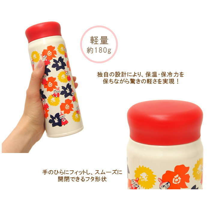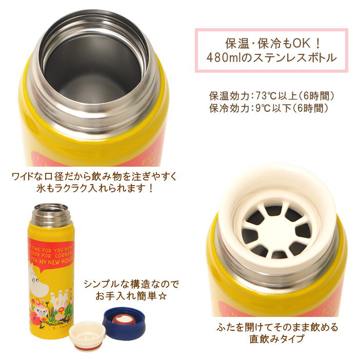 直飲みタイプの保温&保冷ステンレスボトル ・Spec 商品名 ムーミン ステンレスボトル 素材 本体:ステンレス鋼(胴部:アクリル樹脂塗装) フタ・飲み口:ポリプロピレン パッキン:シリコーン サイズ φ約6.5cm×h約19cm 容量:480ml 重さ:約180g 保温・保冷効力 保温効力(スタート95度):73度以上(6時間) 保冷効力(スタート4度):9度以下(6時間) ※内容量や使用状況などにより異なりますので、あくまでも目安としてお考えください。