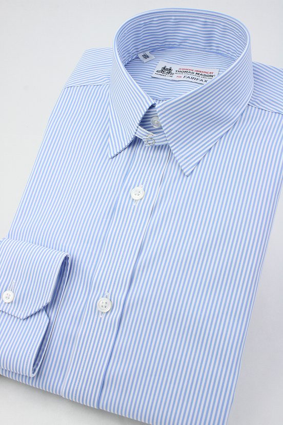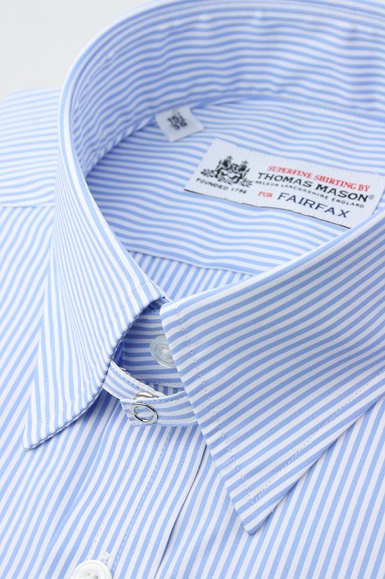 FAIRFAXシャツ::アルビニ(Albini)::トーマス・メイソン(Thomas Mason)/ FAIRFAXタイ/FAIRFAXアクセサリー ブランドFAIRFAX(フェアファクス)衿型タブカラー(スナップ式)剣先:約7cm衿越:約4cmボタン天然貝ボタン、ドレスシャツ用として最高級の白蝶貝を使用前立て表前立てポケットなしカフスシングルカフスバックヨークバック両サイドにダーツベースカラースカイブルー×ホワイトのストライプ素材綿100% コットンポプリン (約1.5mm幅の細かなストライプ) トーマス・メーソン/ Thomas Mason素材特徴イギリスの伝統と風格を受け継ぐThomas Masonの最高級生地を使用いたしました。